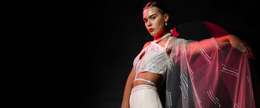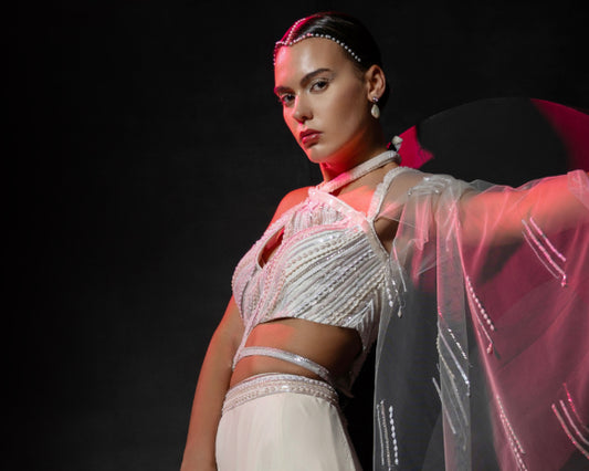 Niharika Jain dazzles in a captivating Vannikaa Malik ensemble, epitomizing elegance and grace. The flowing chiffon cape, exquisitely adorned with intricate sequins and crystal embroidery, drapes...